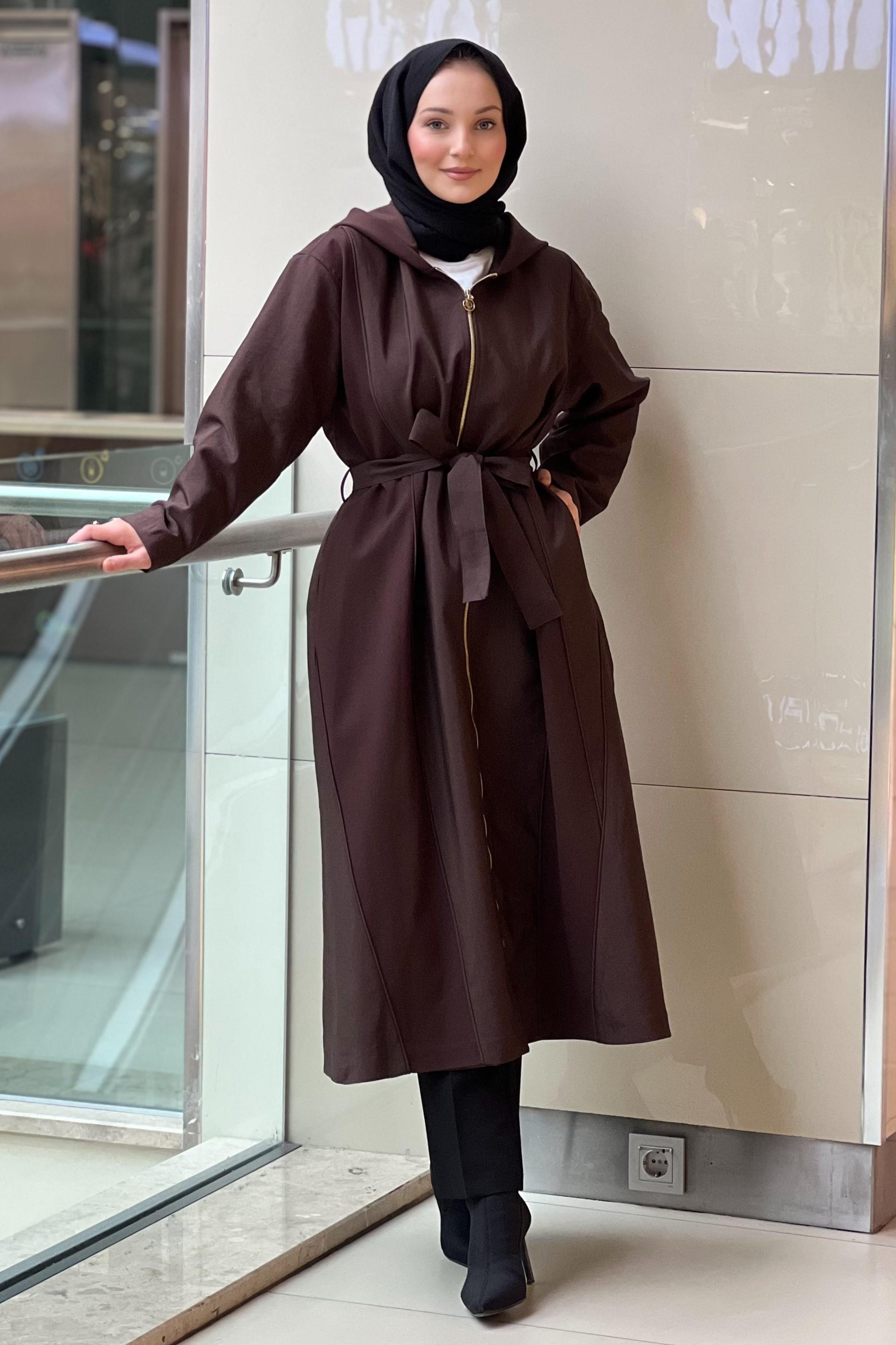 Kapüşonlu Düşük Kol Önden fermuarlı Beli Kuşaklı Cepli Astarlıdır