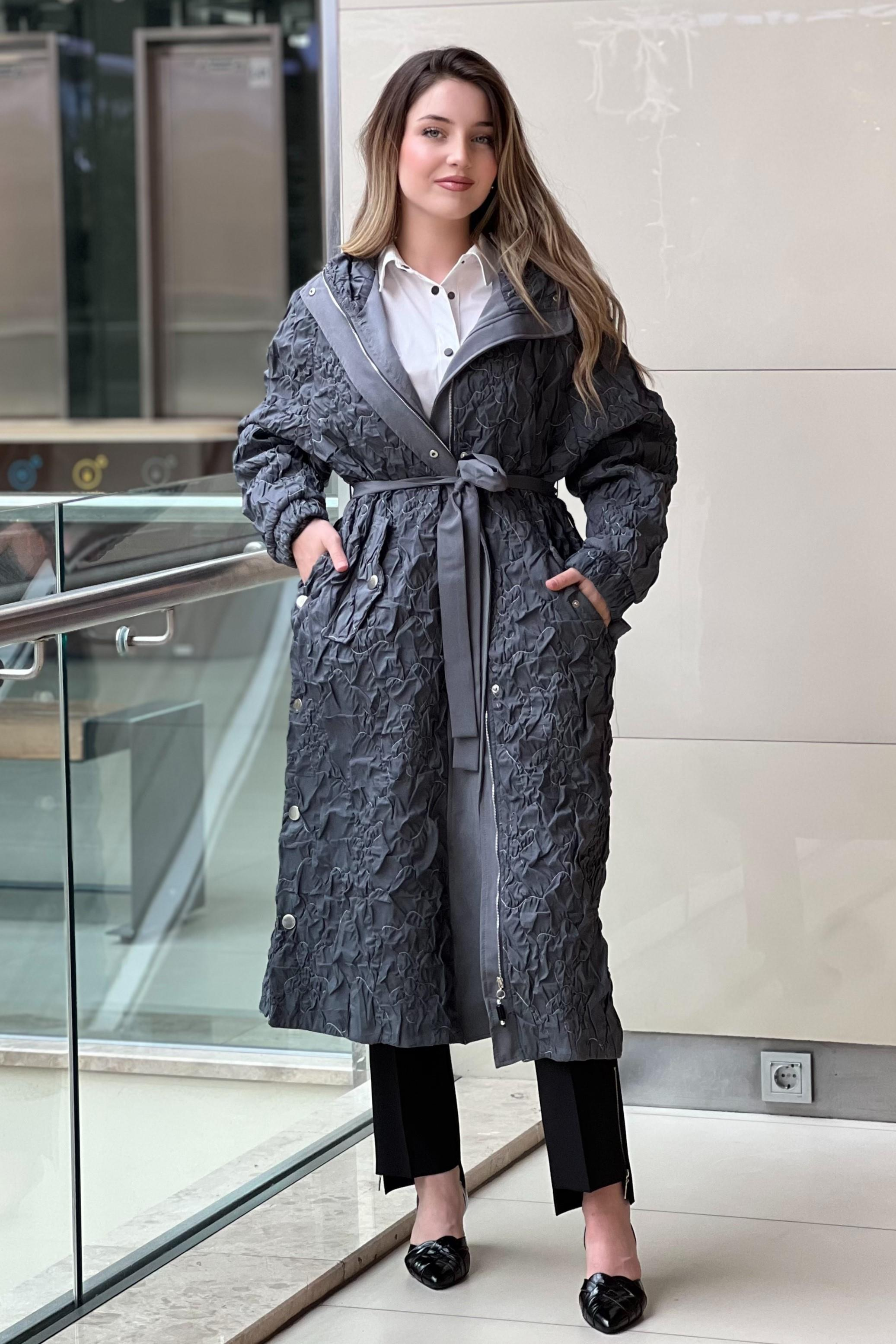 Kapüşonlu Reglan Kol Gizli Fermuarlı Cepli Kuşaklı