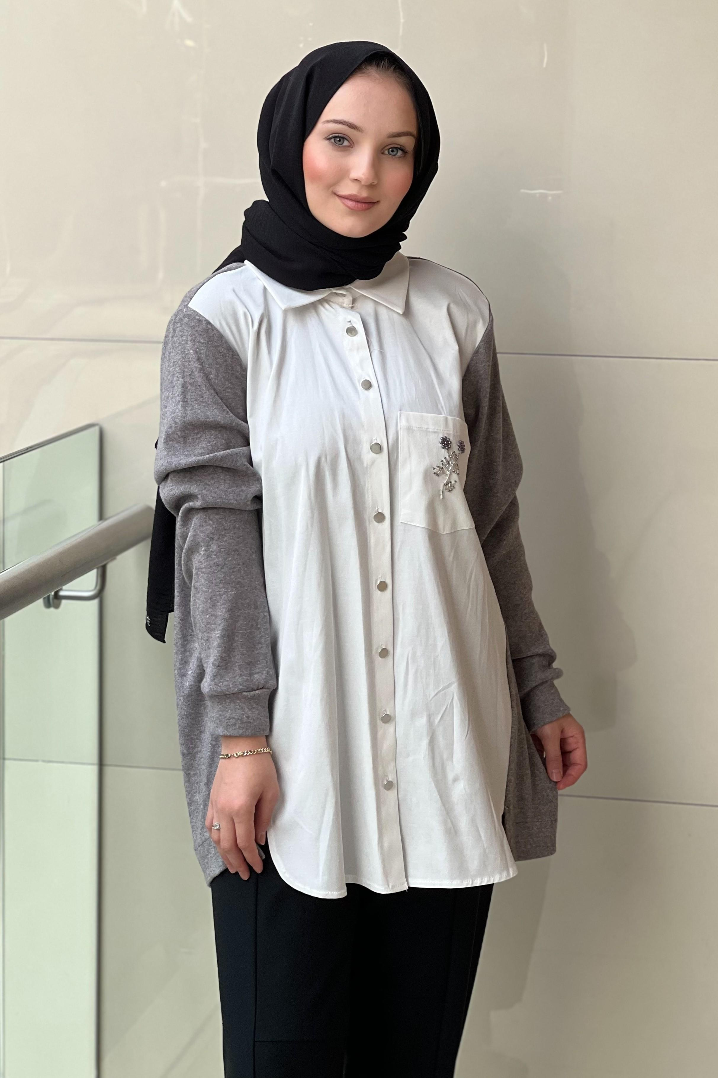 Fuat Gürşen Sırt Ve Kollar Örme Çiçek Taş İşlemeli Gömlek