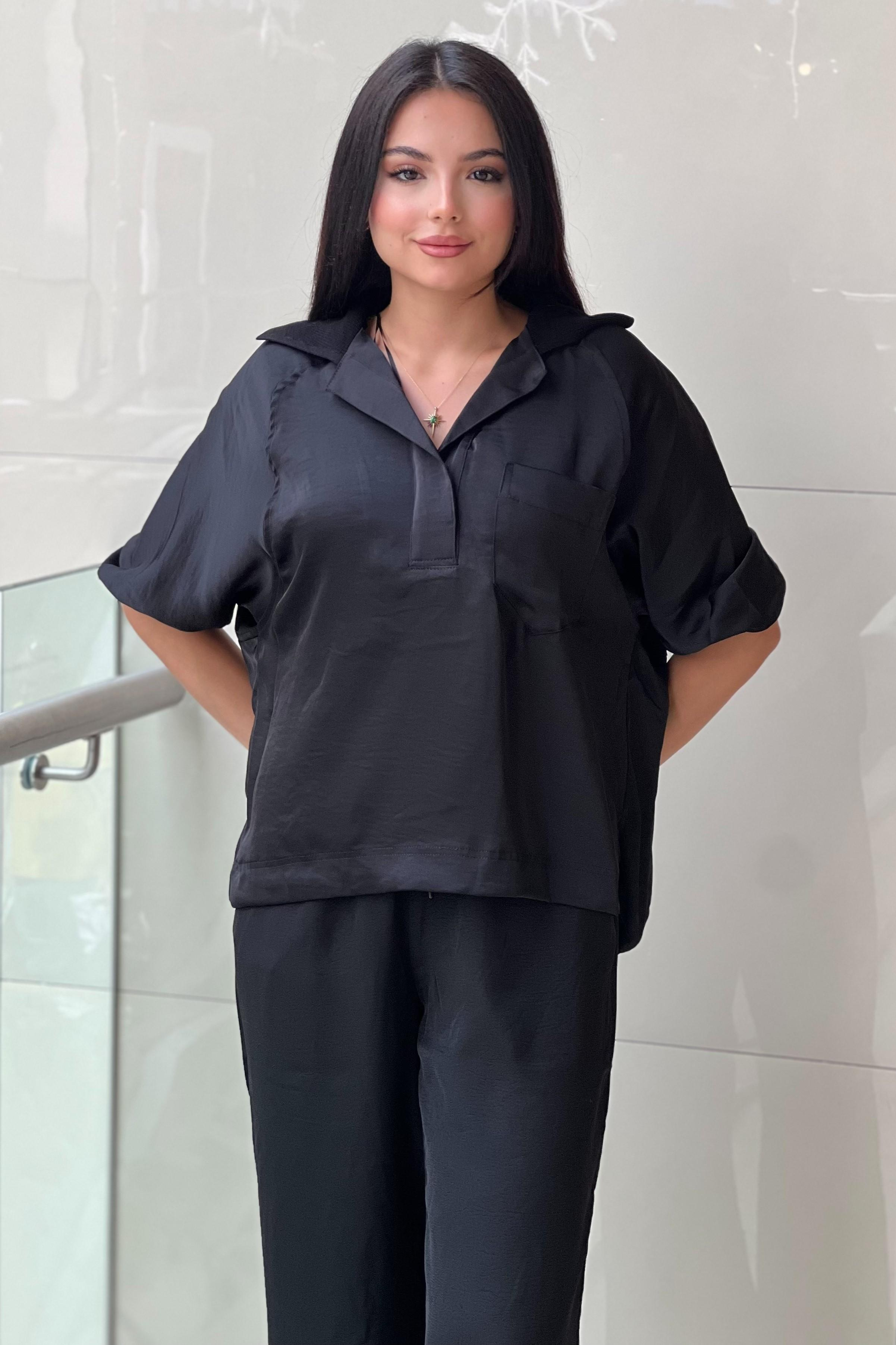 Gömlek Yaka Düşük Kısa Kol Beli Arka İp Bağlamalı Yandan Yırtmaçlı Bluz