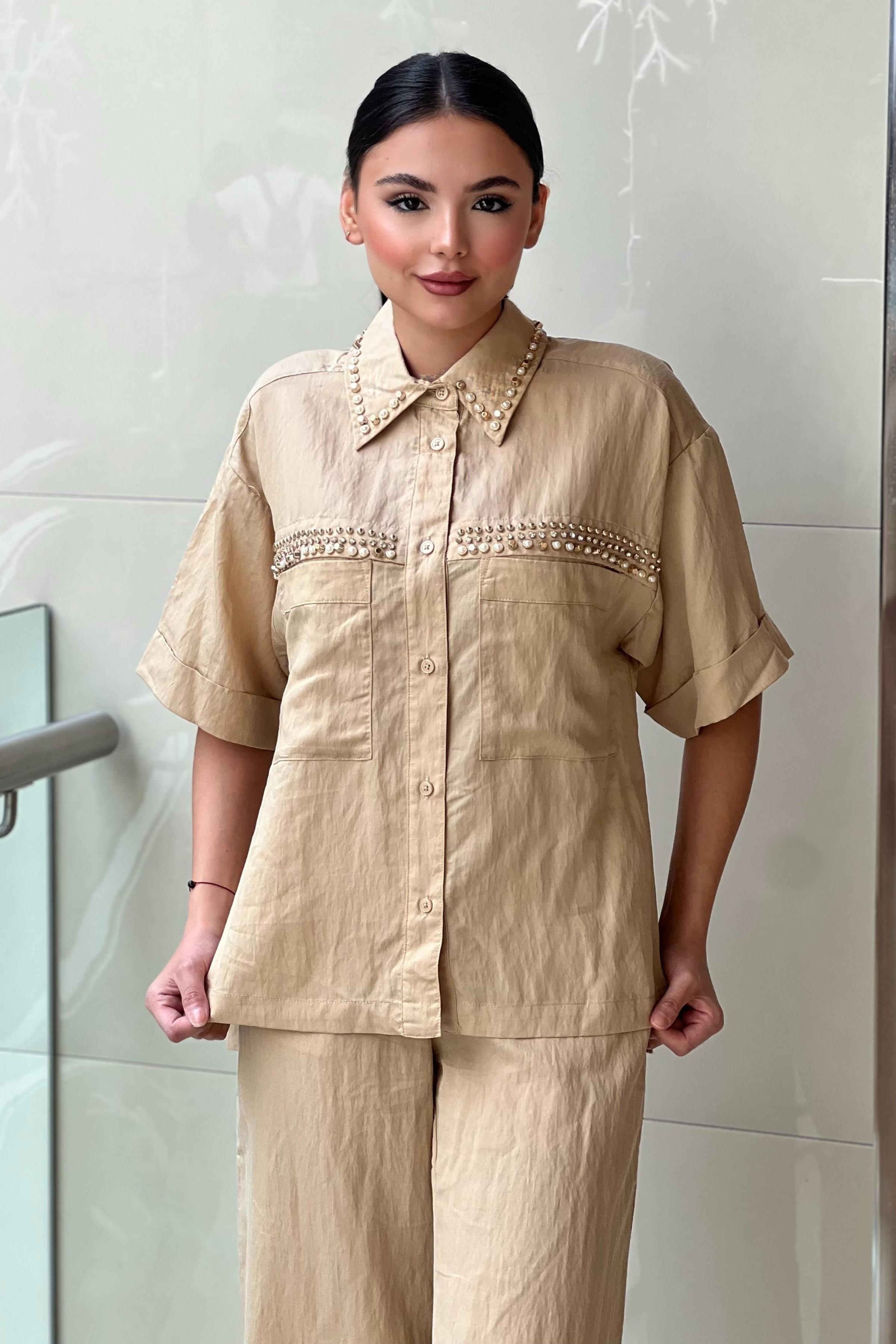 Gömlek Düşük Kol İnci İşlemeli Kısa Kolludur