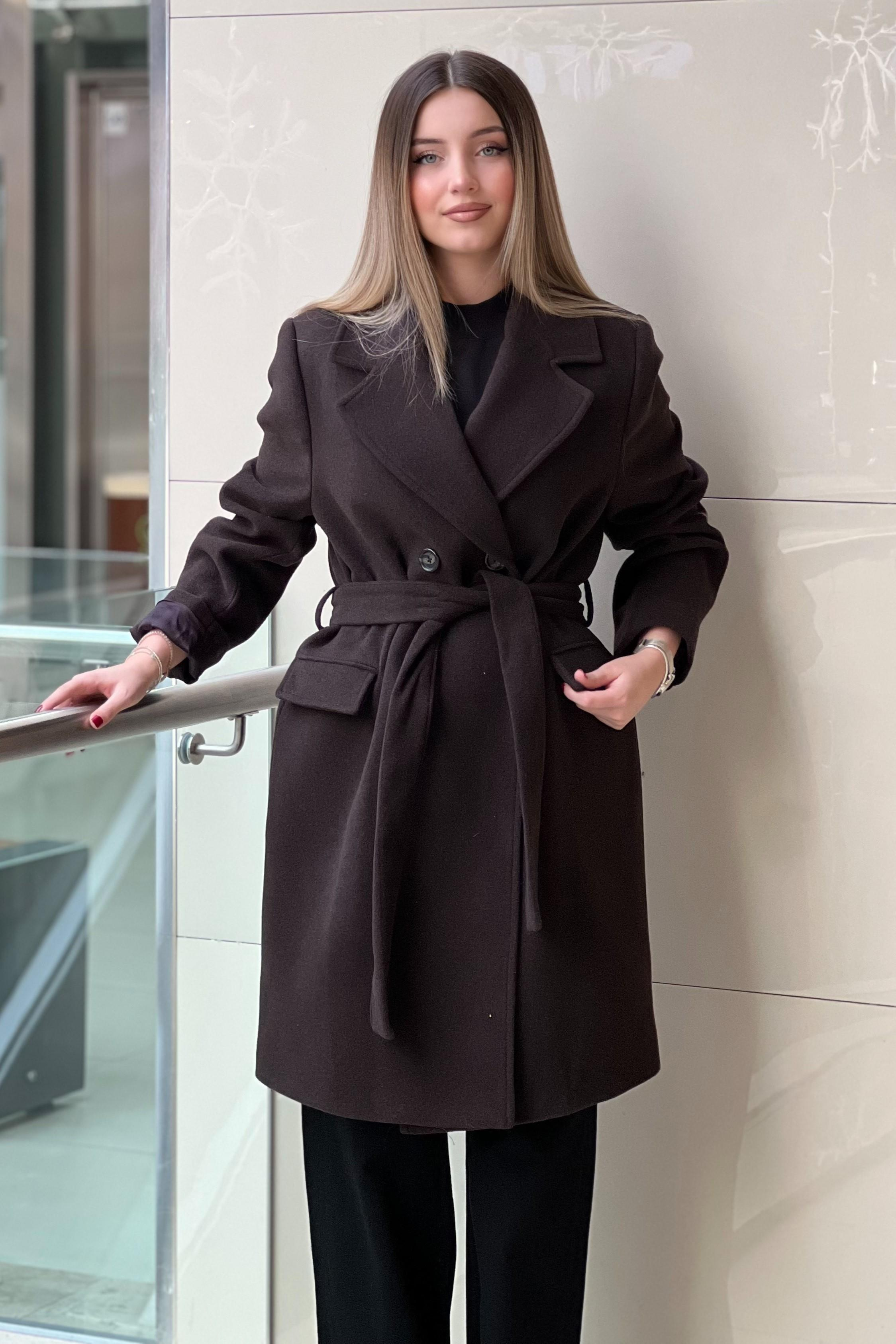 Kuşaklı kruvaze tasarımı ve kaşe dokusuyla modern bir klasik yaratan bu dizüstü kaban