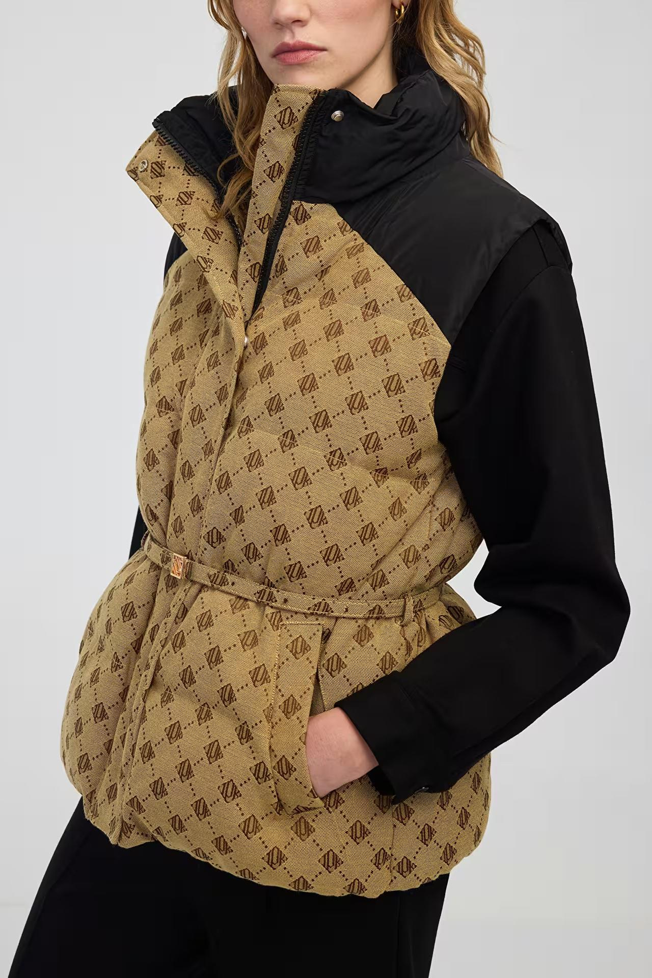Bel hattına eklenen monogram tokalı ince bir kemerle tamamlanan yelek, vücut formunu zarafetle vurguluyor.