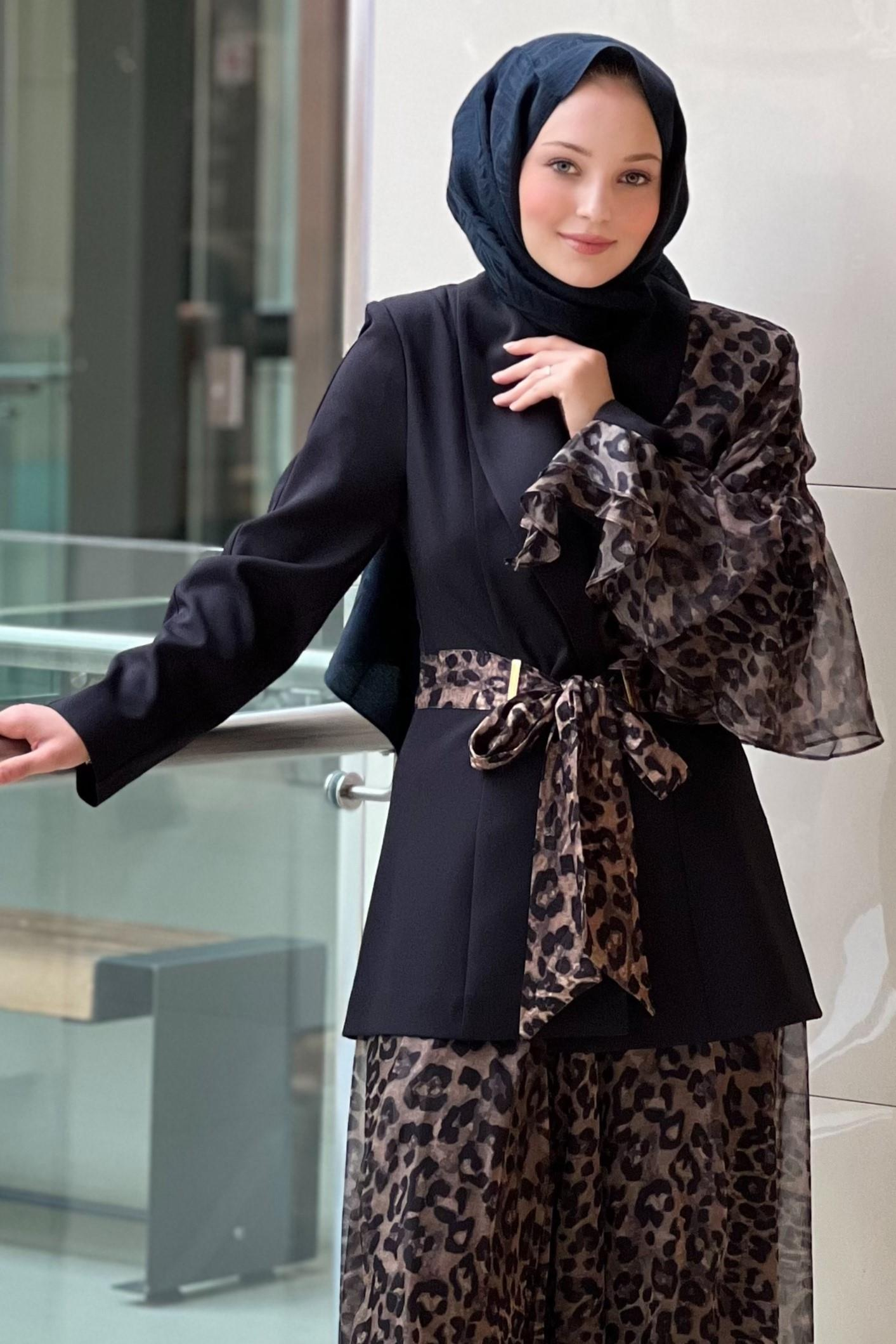Kruvaze Yaka Takma KOl Şifon Şal Detaylı Önü Açık Kuşaklı