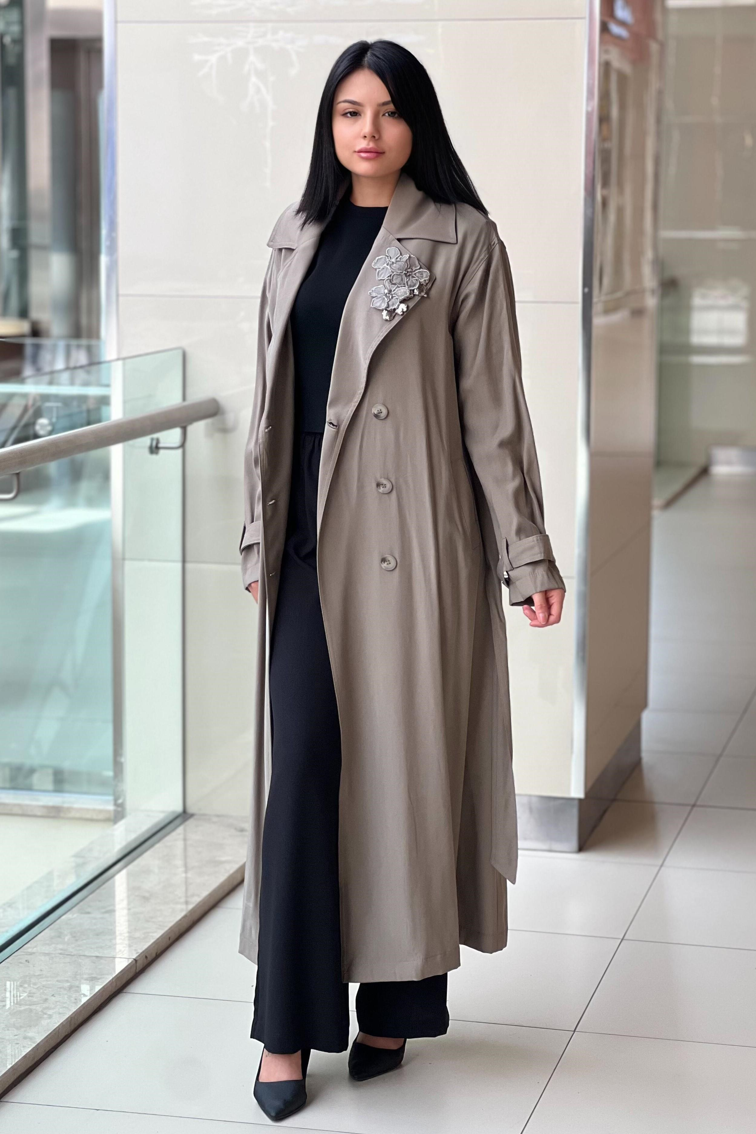 Kuruvaze Yakası İşli Düğmeli Ve Kuşaklıdır