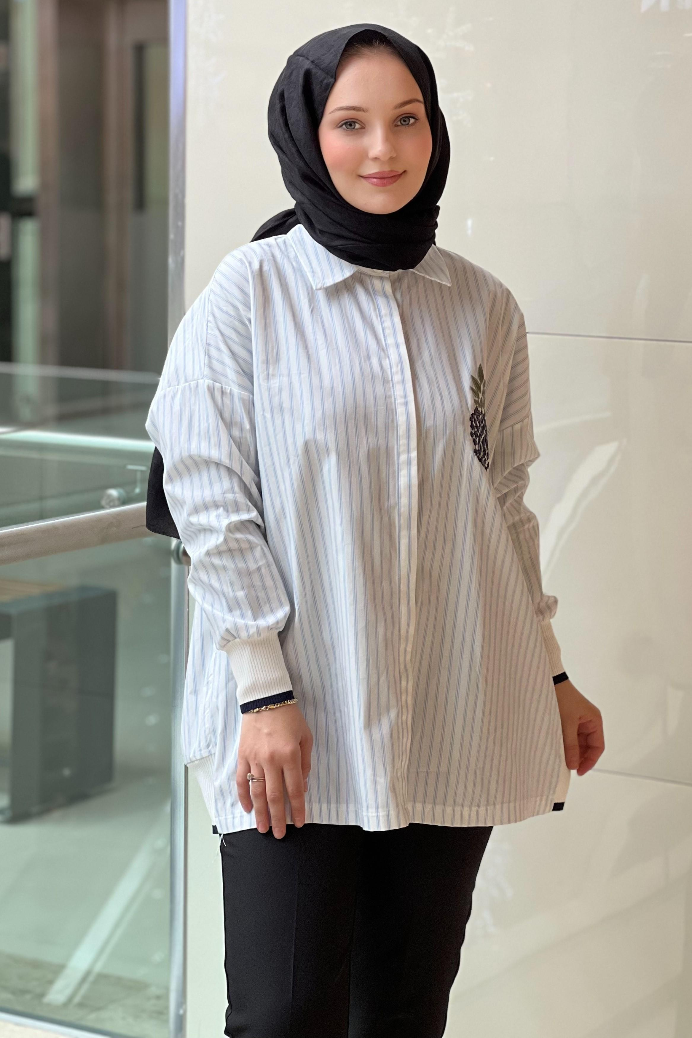 Gömlek Yaka Düşük Kol Gizli Düğmeli Triko Ribana Detaylı