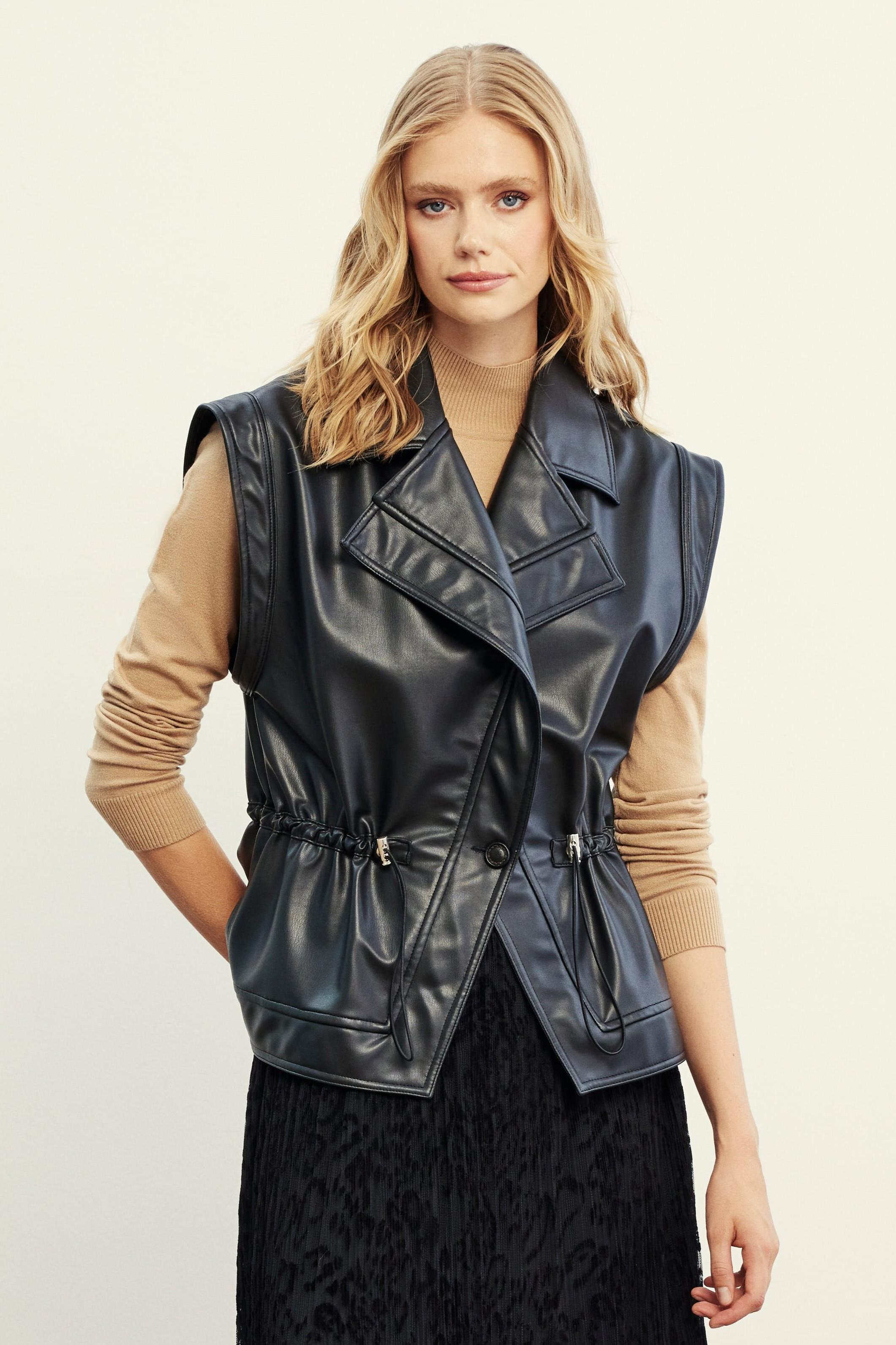 Kruvaze Yaka Kolsuz Tek Düğmeli Bel Büzgülü