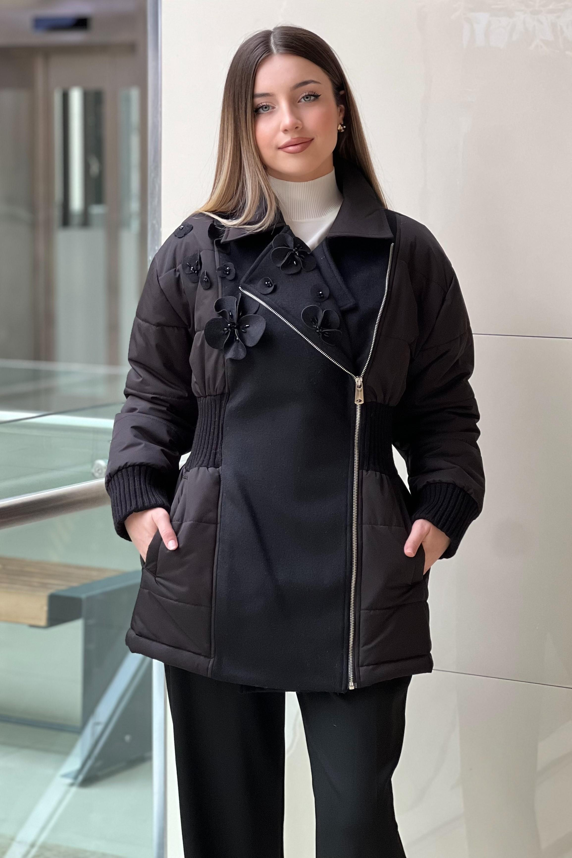 Kruvaze Yaka Düşük Kol Fermuarlı Bel Triko Büzgülü Cepli Ve Astarlı Rahat Kalıptır